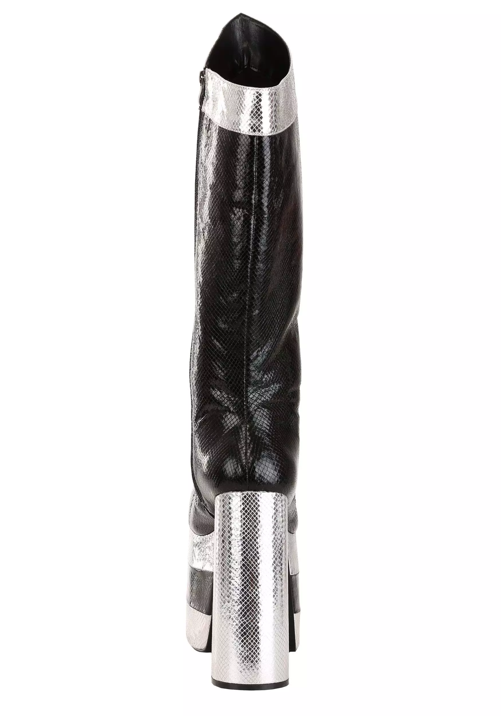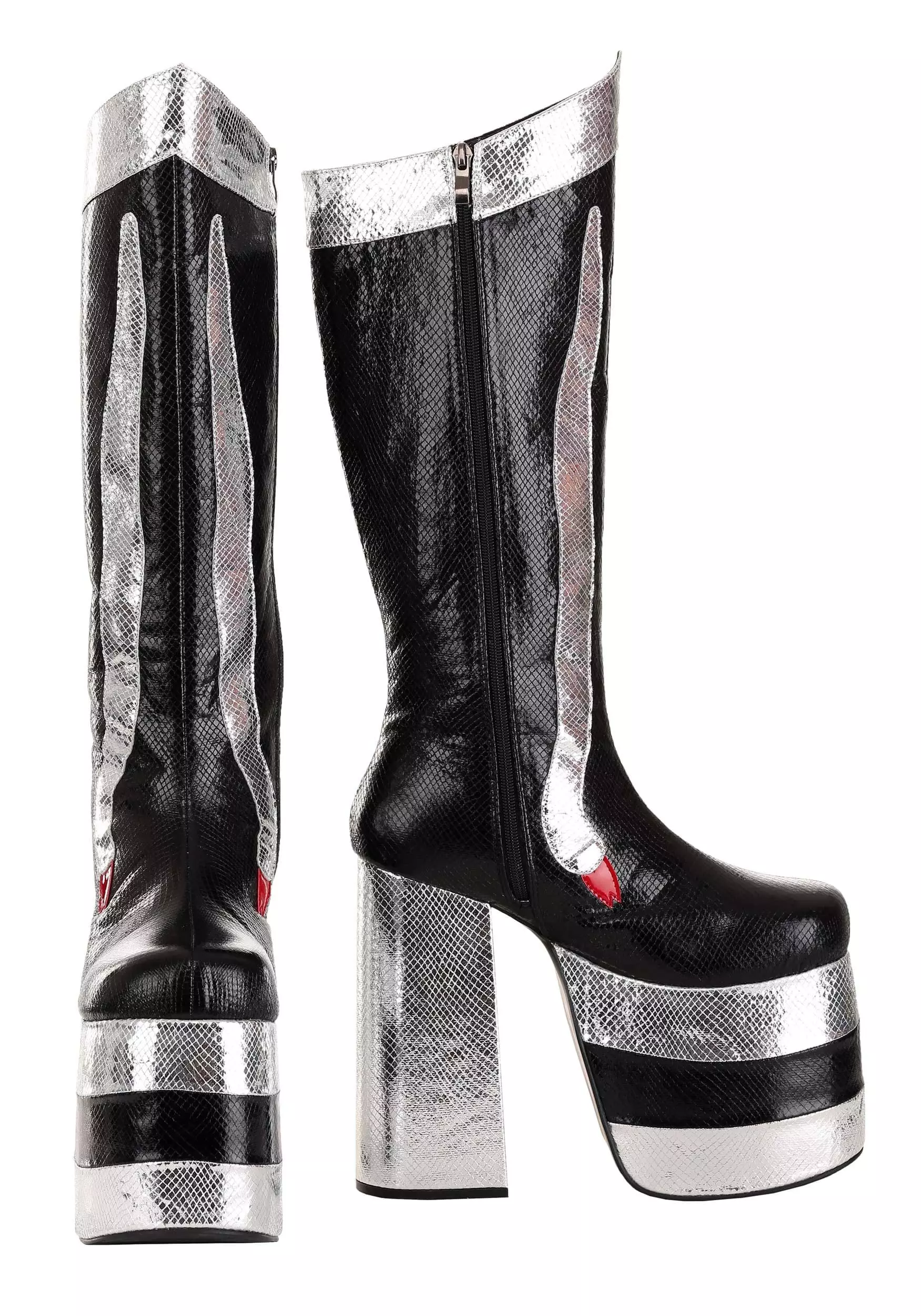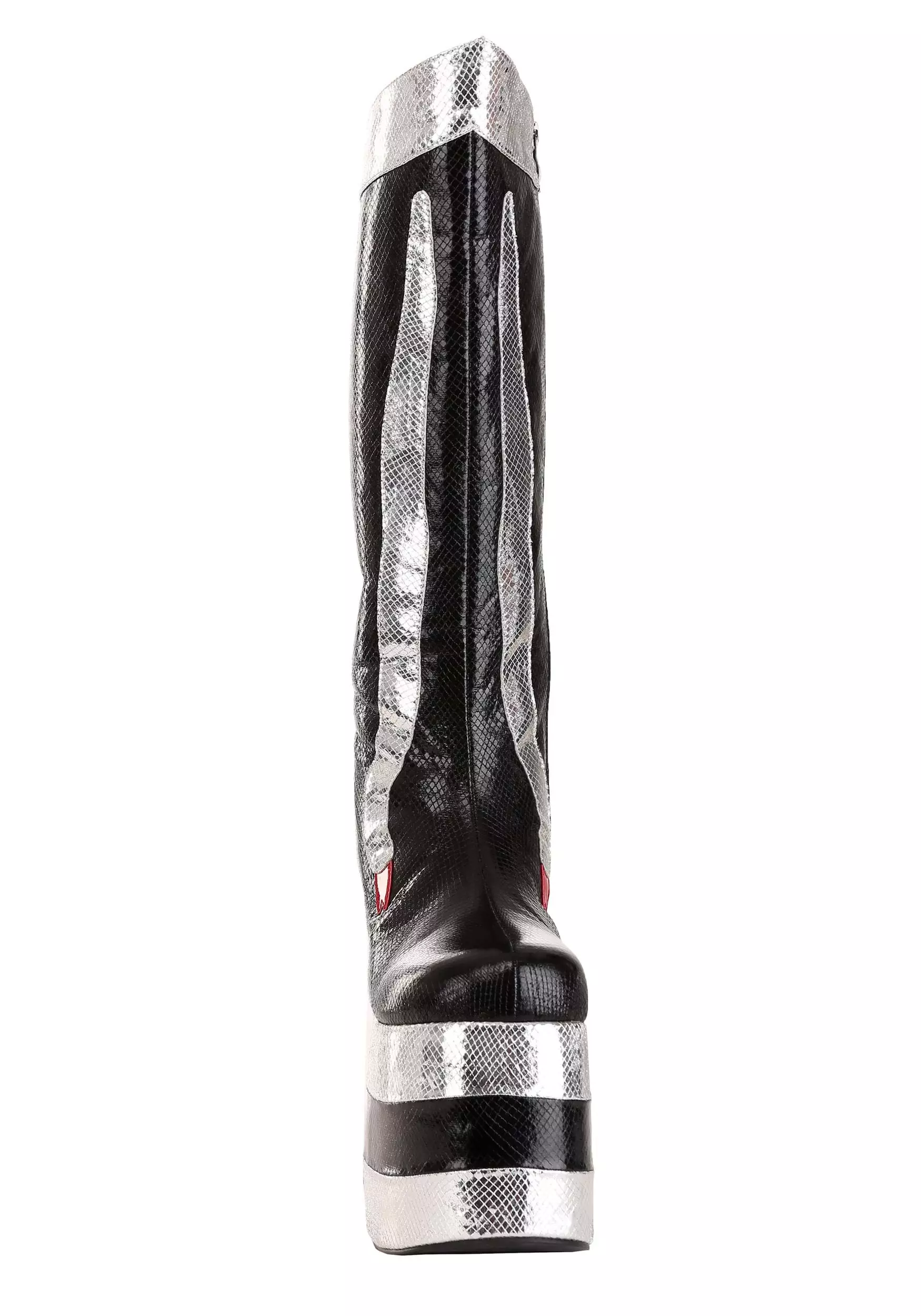 Rock and roll all night and party every day in these exclusive Catman KISS Boots! The black and silver knee-high boots are made of faux snakeskin and even have snake detail that will make you hiss with delight. They zip up the sides for easy wearing. Sky-high platforms just add to the fun.Â