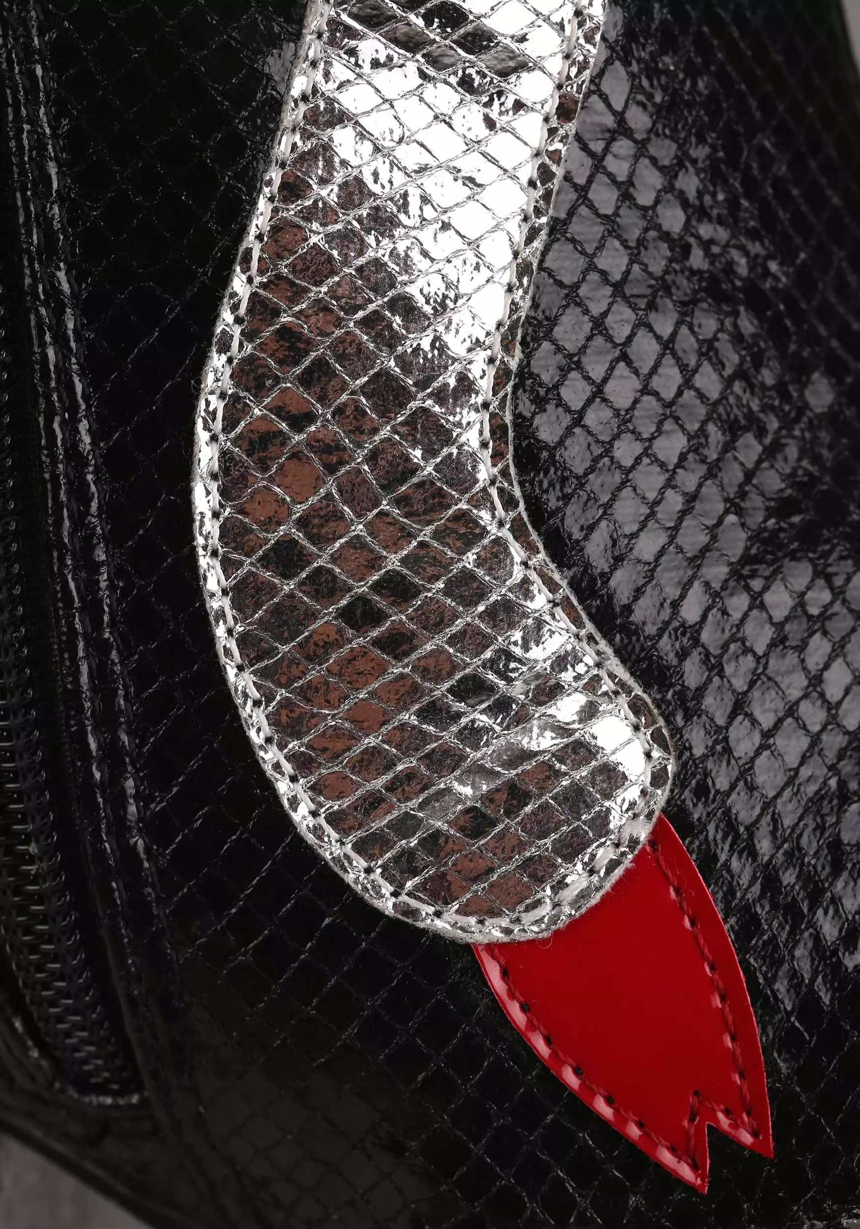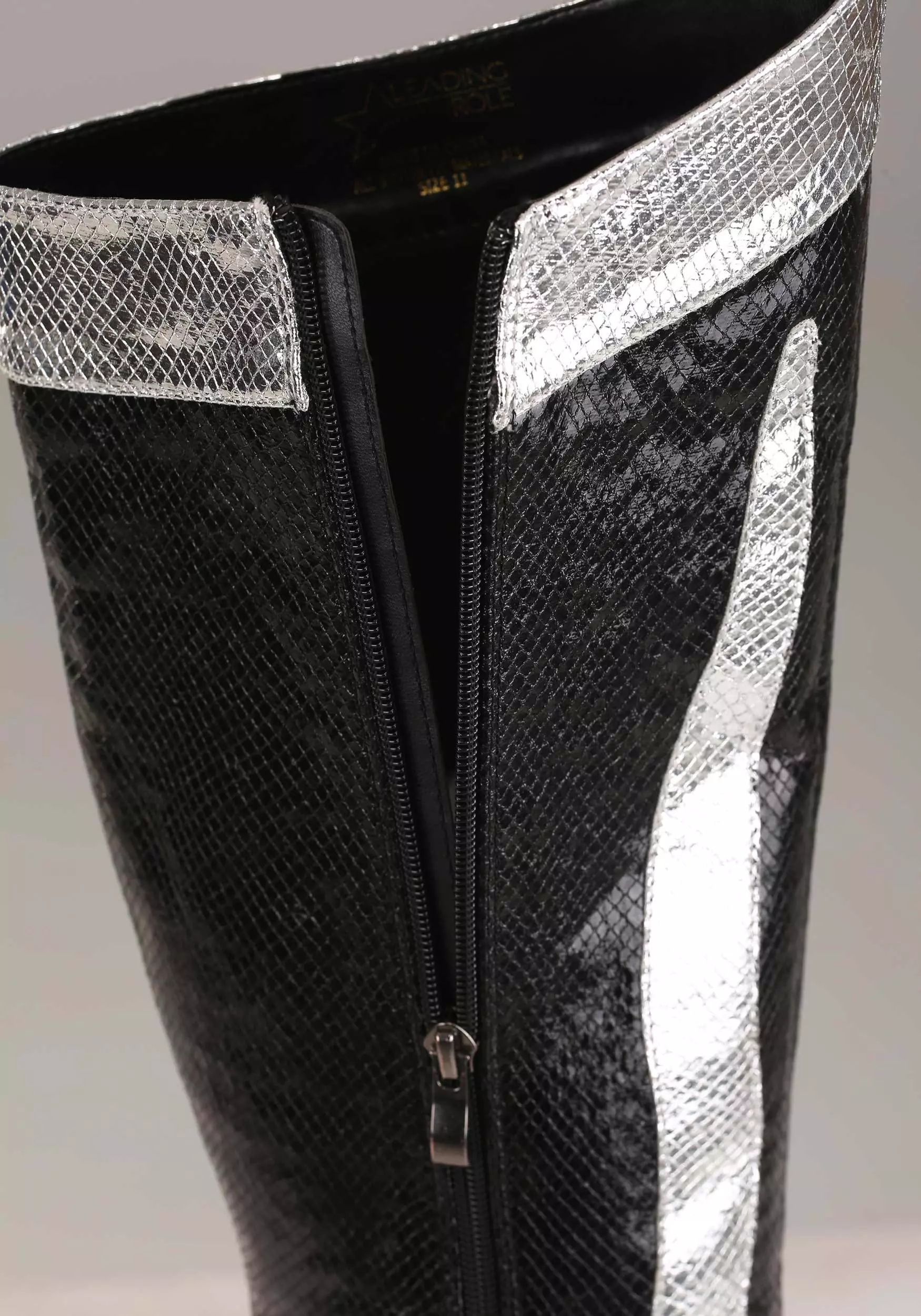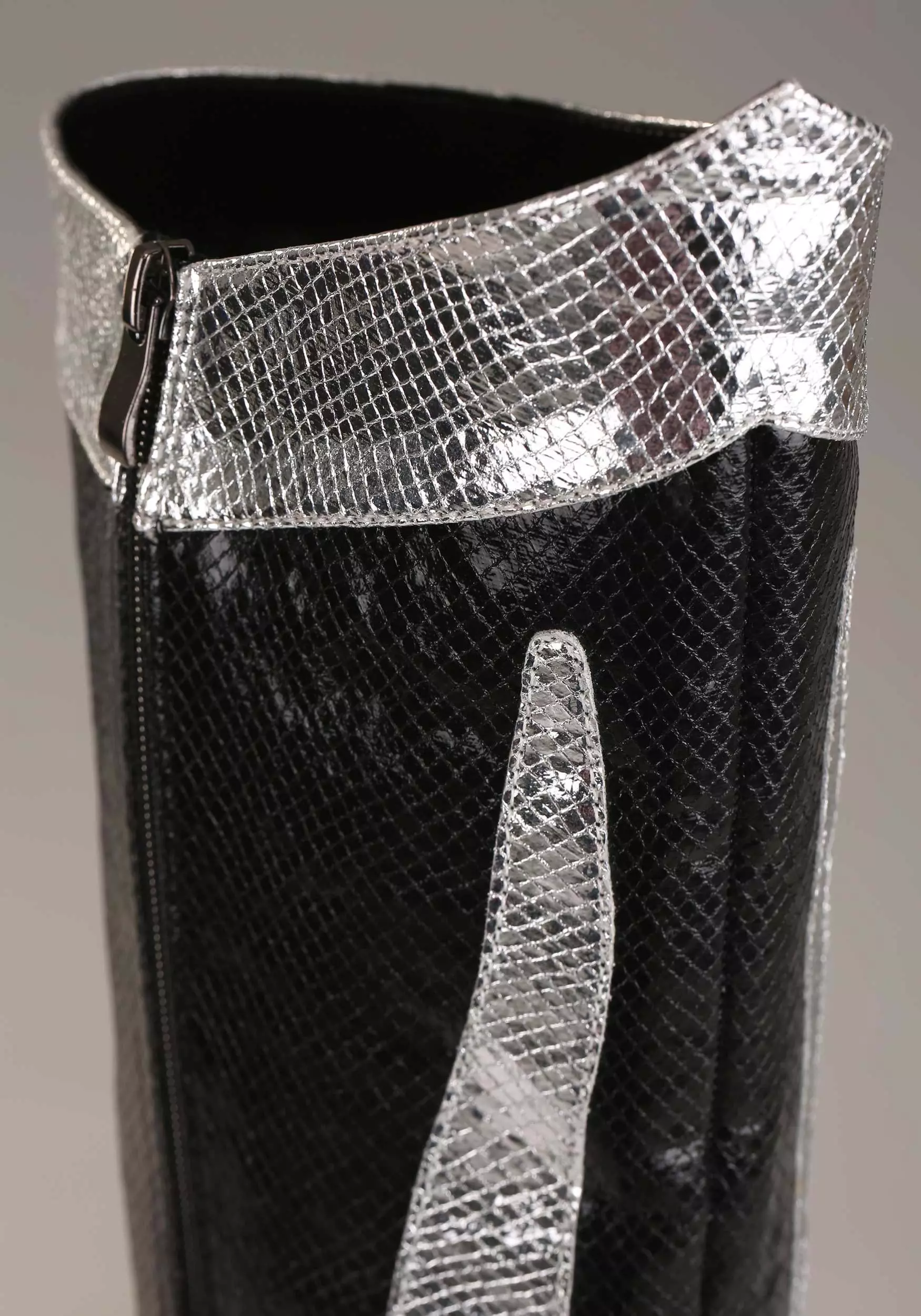 Rock and roll all night and party every day in these exclusive Catman KISS Boots! The black and silver knee-high boots are made of faux snakeskin and even have snake detail that will make you hiss with delight. They zip up the sides for easy wearing. Sky-high platforms just add to the fun.Â