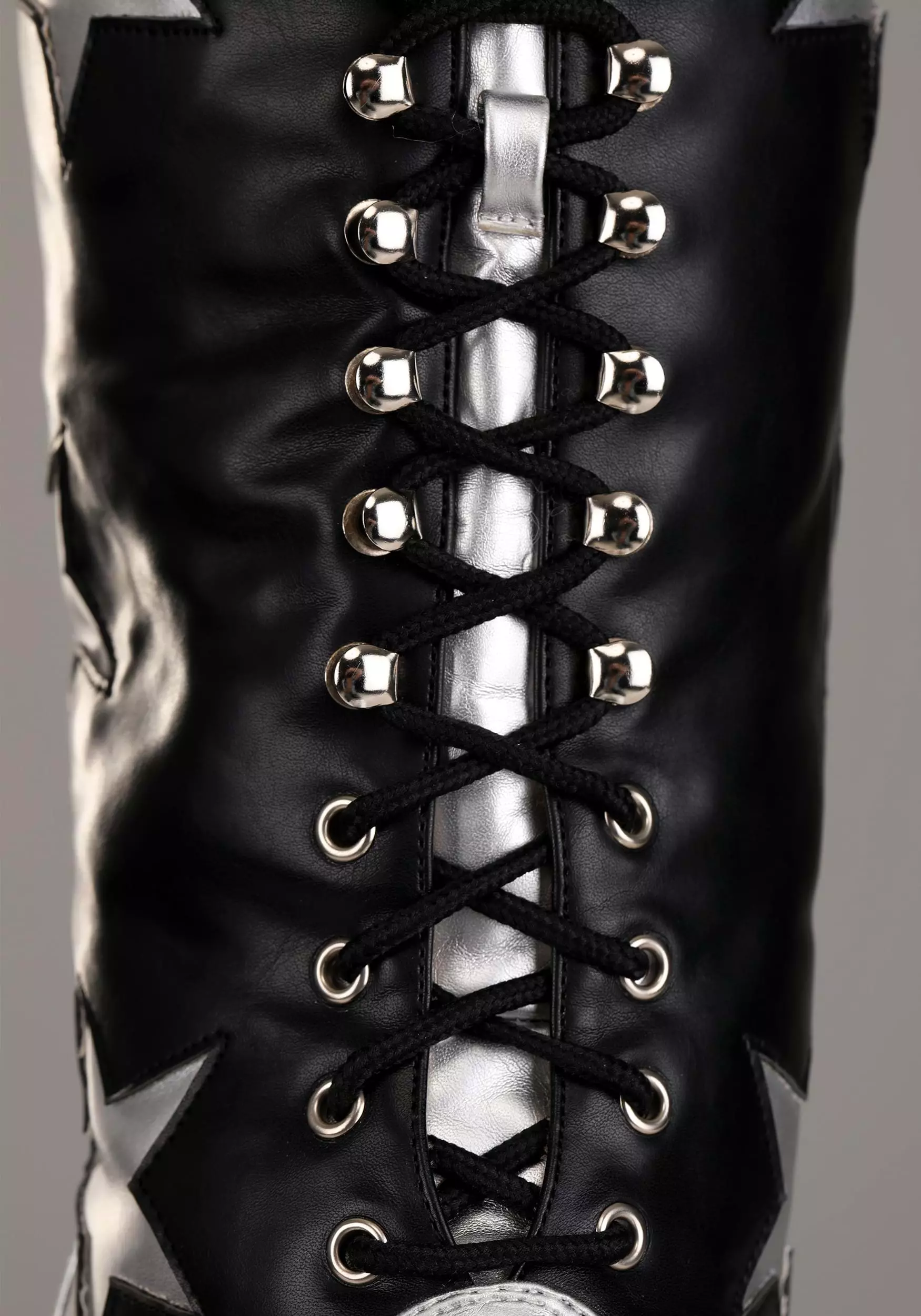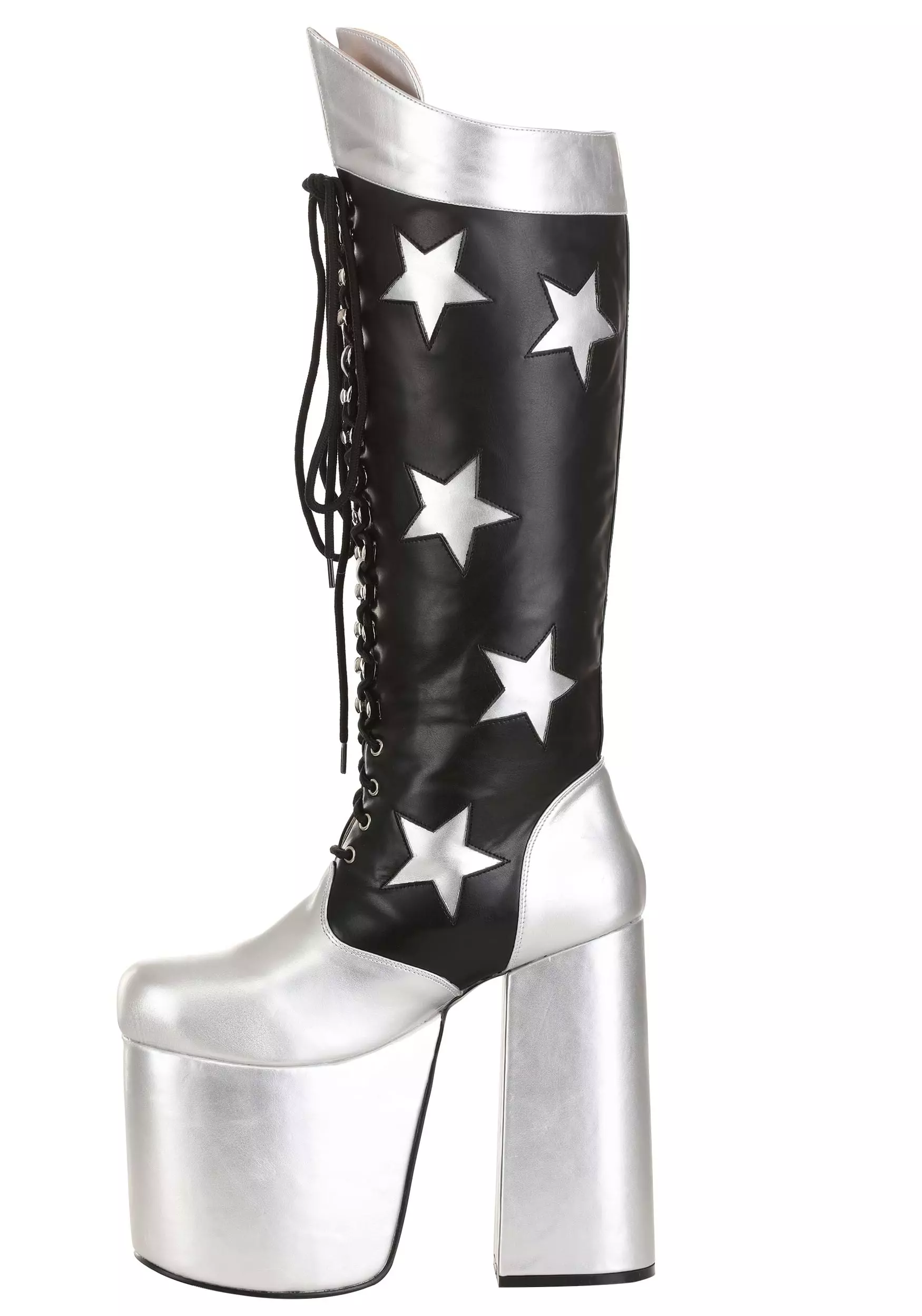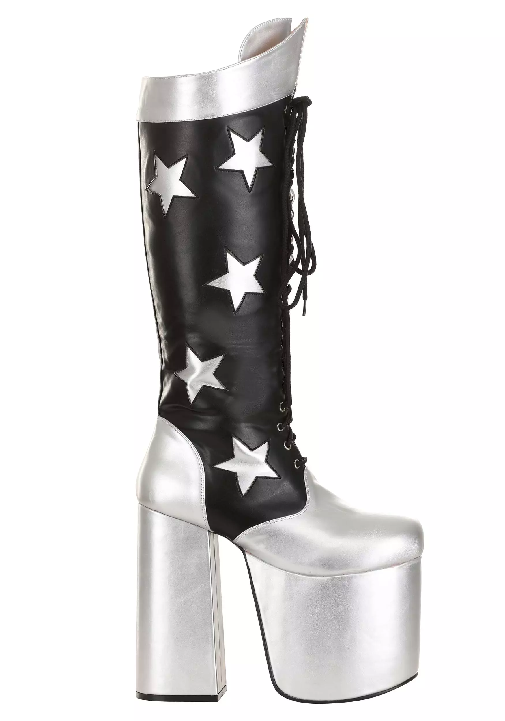These officially licensed boots are inspired by the ones worn by Starchild during KISS tours. They’re made out of a black vinyl material and have a lace-up front. Silver vinyl stars are stitched onto the sides of each boot and the large platform bottoms are a matching metallic silver. The top of the boots has a bright silver cuff to round out the whole look. You can pair them up with one of our Starchild costumes to transform into the legendary guitarist from KISS! Just be sure to check out all of our KISS accessories to craft a realistic outfit, so you can step on stage with confidence.