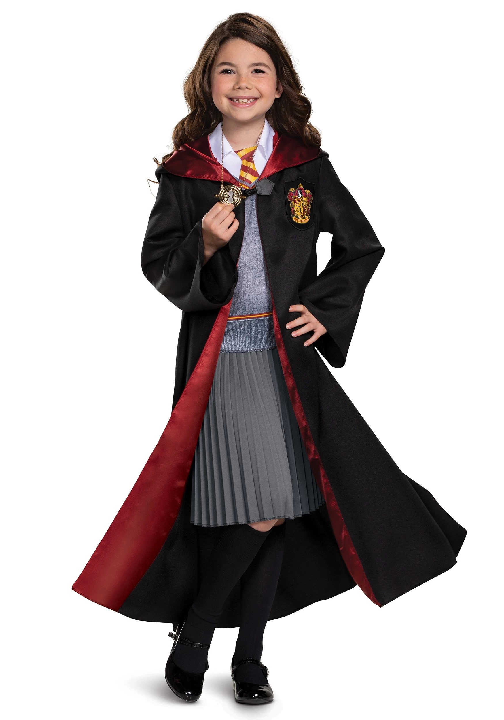 This officially-licensed Harry Potter Hermione costume features a pull-over dress layered underneath silky Gryffindor robes. The dress has a long pleated skirt and a top with a tie and collar printed to look like the Hogwarts uniform. The robe is trimmed with a deep red along the inner opening and hood. A patch on the chest will make your kiddo a proud resident of the Gryffindor house.Â