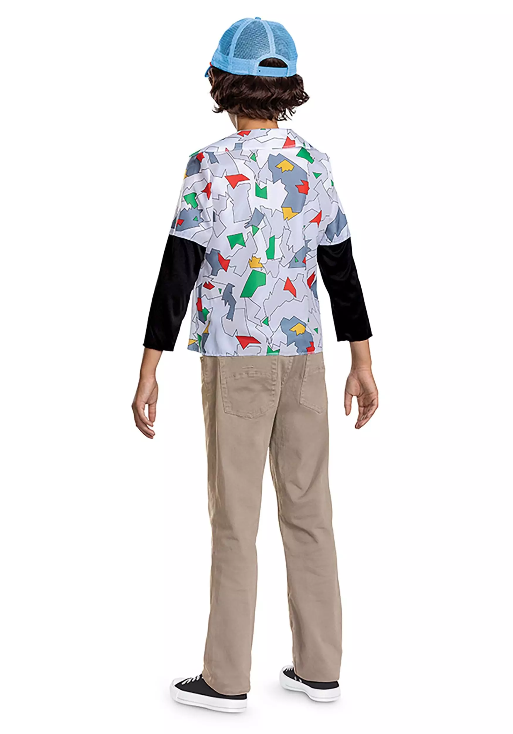 Your child is sure to look like part of the party with this Kid’s Dustin Costume Kit! It’s styled like his ensemble in the fourth season of the hit Netflix show. Start the outfit with your kiddo’s favorite pair of shoes and their own comfy pants. The costume makes achieving Dustin’s look easy with a one-piece top that combines his iconic Hellfire club tee and graphic shirt. The front features the club’s logo and says “Hellfire Club” across the top. Dustin’s awesome Thinking Cap is also included to top things off.