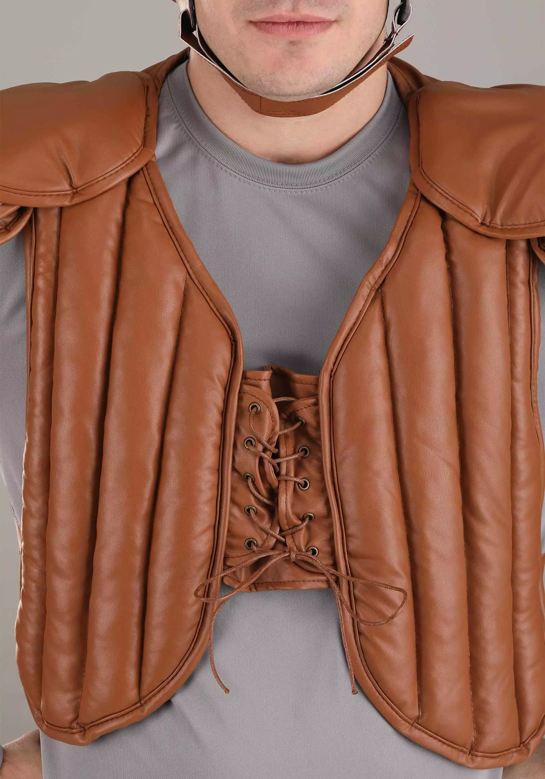 - Gauntlets and shin guards are held in place by length-adjustable faux leather straps with metal buckles
