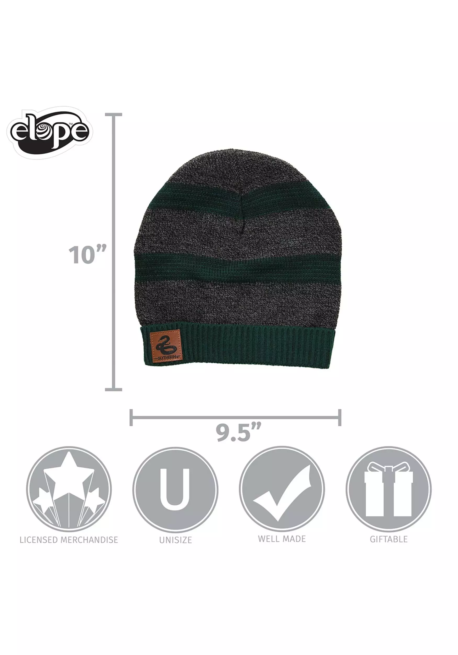 Fight a dull color palette and keep warm with this stylish Slytherin Heathered Knit Beanie! Stripes of deep forest green and grey add just a pop of color to your otherwise black Hogwarts wardrobe. Attached to the ribbed brim a simple, but sophisticated faux leather patch features the Slytherin serpent for added interest. Officially licensed and made one size fits most, you’ll keep your confident composure even while dressing outside the Slytherin comfort zone.