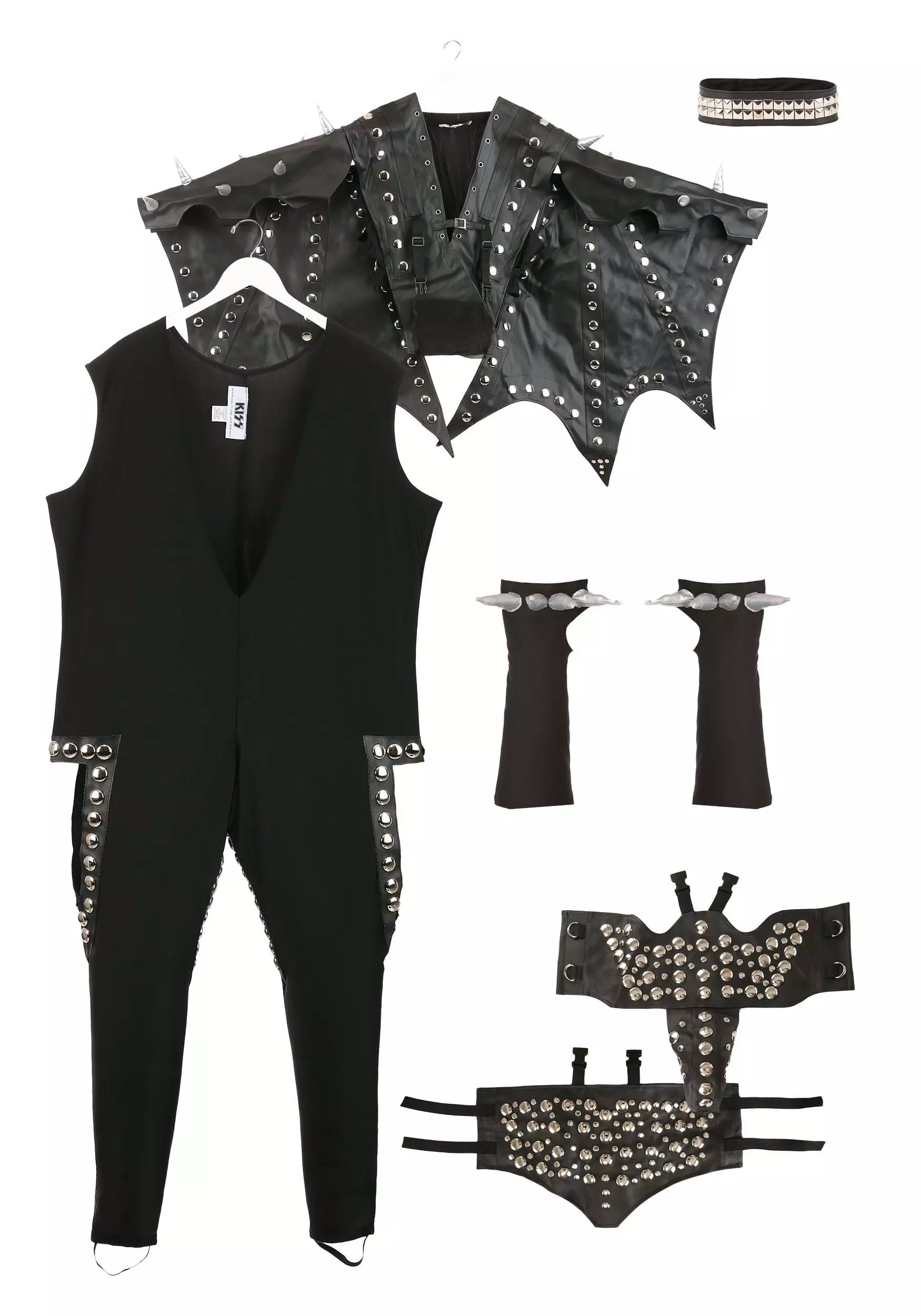 Transform into the ultimate rocker with this authentic and officially licensed Gene Simmons costume. It spares no detail when recreating the classic look of the KISS leading man. The jet black bodysuit stretches to fit. It is made of a spandex and polyester blend that will hug your body in true rock and roll fashion. Rows of metal studs and faux leather pieces create the iconic stage look. The included vest has attached demon wings, which also feature matching metal studs. Each sleeve has metallic foam-stuffed fabric spikes. The front and back codpieces also have metal studs and fit with hook and loop fastening. Matching gloves and a choker finishes the look for a highly detailed and authentic recreation of the outfit worn by Gene Simmons on stage.