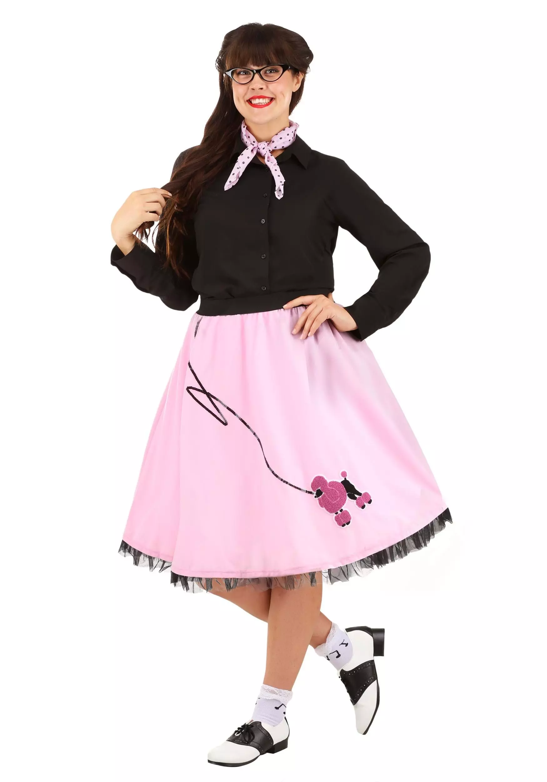 You’ll have it made in the shade with this Plus Size Women’s Sock Hop Kit! Keeping the 1950s alive and well, our talented team of designers provided everything but the blouse in this nifty accessory set. Start your look with the bubblegum pink circle skirt featuring an appliqued poodle. Paired with the included white ankle socks and pink polka-dot chiffon scarf, you’ll look the talk of the town with little effort! Polish off the look with the trendy black plastic horn-rimmed glasses and your favorite hairdo, and Susan won’t stand a chance when you stroll into the bash!