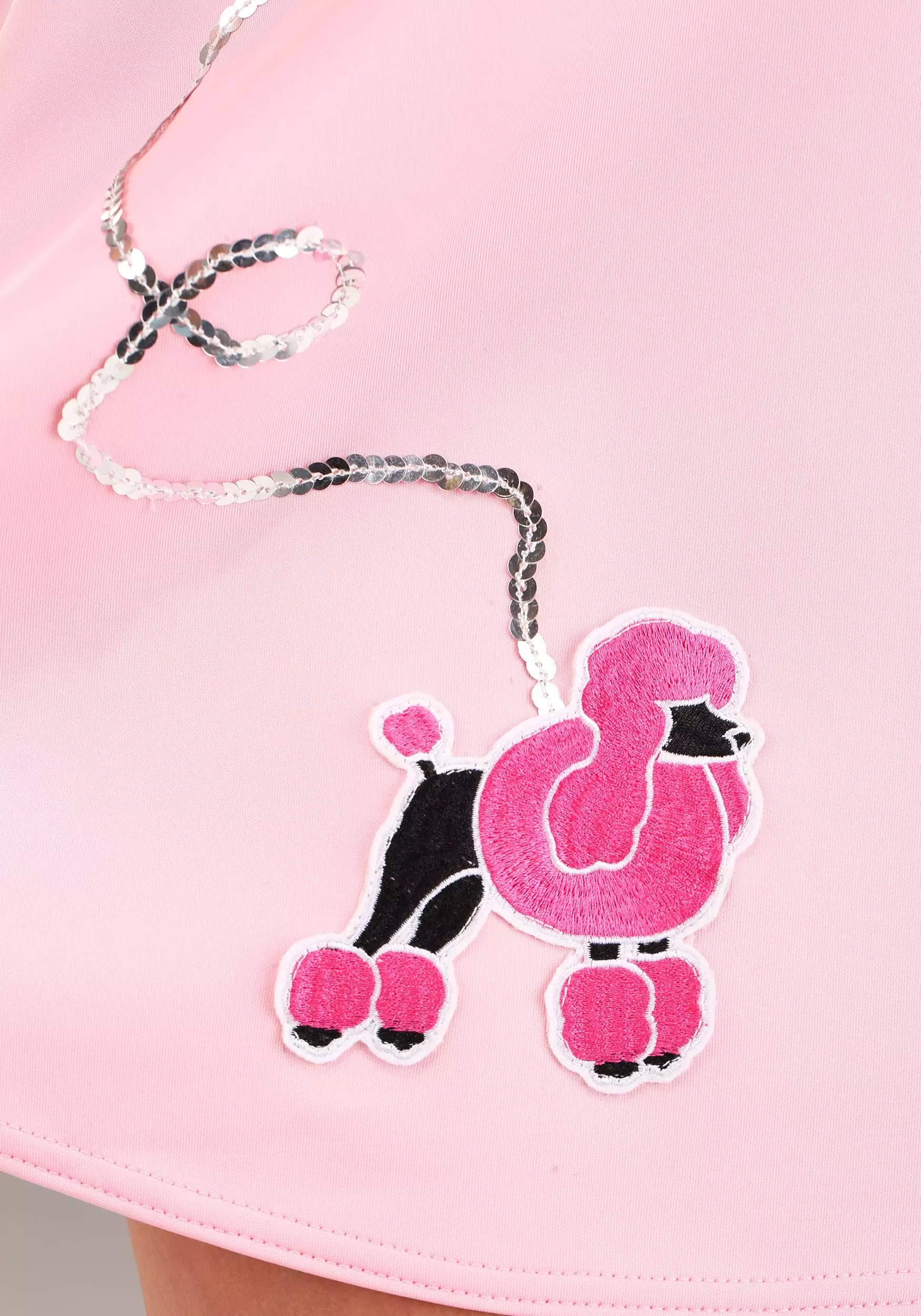 This hip and adorable Women’s Roller Skate Rita costume will have you on cloud nine! Look fresh as a daisy in your off-the-shoulder black shirt that will have all the boys crashing into the rink walls because they forget to look where they’re going. The sassy little pink skirt flounces beautifully as you skate and features a sweet pink poodle with a silver sequin leash. Add the black belt with the flirty bow and tie the pink scarf in a jaunty knot around your neck.Â
